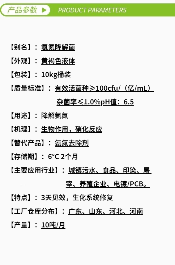 本品是經(jīng)過篩選培養(yǎng)的超強硝化細(xì)菌,具有更強生物活性及耐毒性,同時產(chǎn)品添加營養(yǎng)元素,可以顯著提高細(xì)菌的生長繁殖速度,更好抵抗負(fù)荷沖擊,穩(wěn)定污水系統(tǒng)的硝化效率。