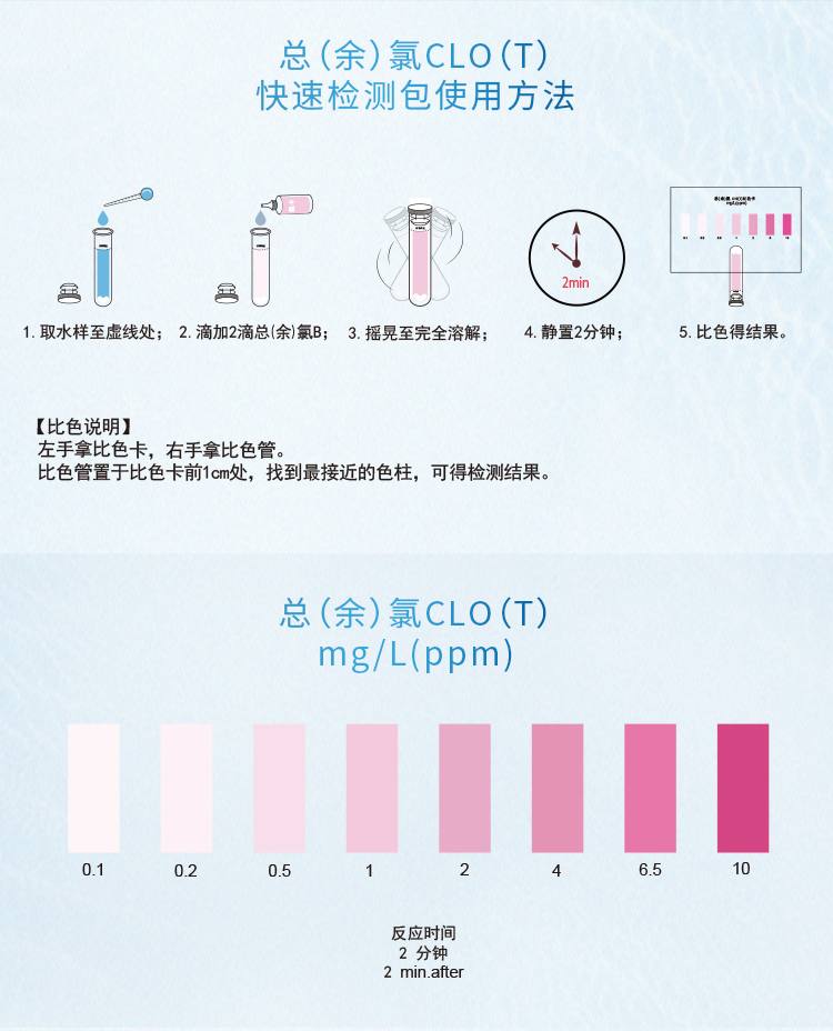 2、本產品檢測水中總(余)氯ClO(T)含量在0~10mg/L(ppm)范圍內,濃度過高會產生紅色沉淀而影響比色,若要檢測10mg/L以上濃度水樣,請預先稀釋水樣后再進行測定,具體操作見稀釋說明書。。
